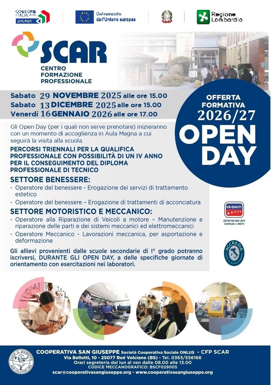 SABATO 29 novembre 2025 alle ore 15.00 il CFP SCAR apre le porte alle ragazze ai ragazzi delle scuole medie che per l’anno prossimo dovranno scegliere quale scuola superiore frequentare.